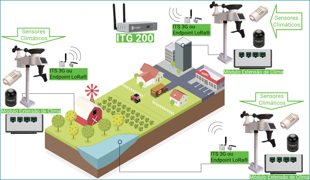 Em sua aplicação típica, o extensor climático se integra aos sensores climáticos para agregar inteligência e automação em projetos de agronegócio, indústria 4.0 e cidades inteligentes.