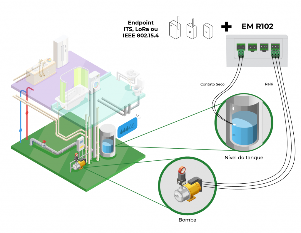 Ao atingir um nível predeterminado de água no tanque, a extensão aciona a bomba.