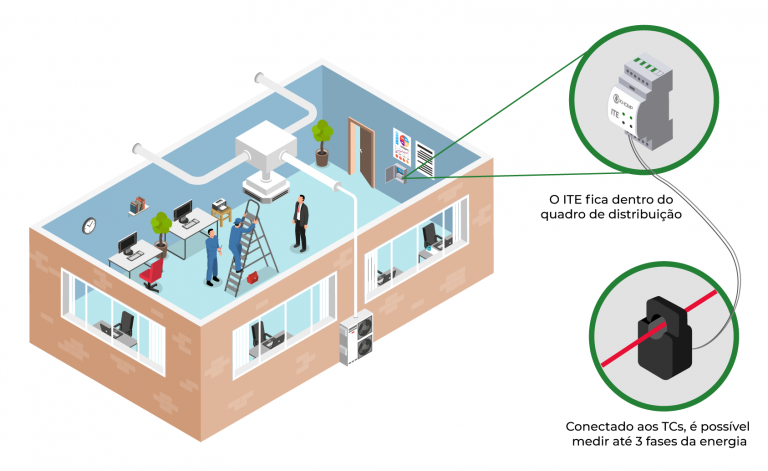 Instalado no quadro elétrico, junto aos disjuntores, o ITE 11LI, conta com saídas TCs (Transformadores de Correntes) para monitorar múltiplos pontos de energia. Na prática, os TCs fazem a ligação direta e não intrusiva entre o quadro elétrico e os equipamentos espalhados pelo cenário, como geladeiras industriais ou ar condicionado.